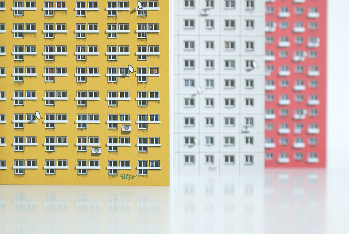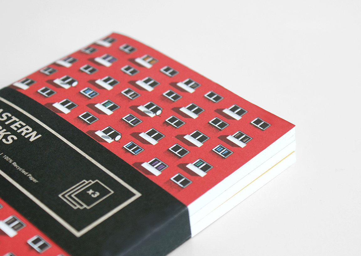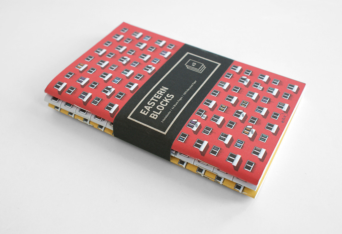 Okładki notesów przedstawiają ilustracje inspirowane powojennymi modernistycznymi osiedlami mieszkaniowymi Moskwy, Warszawy i Berlina Wschodniego.